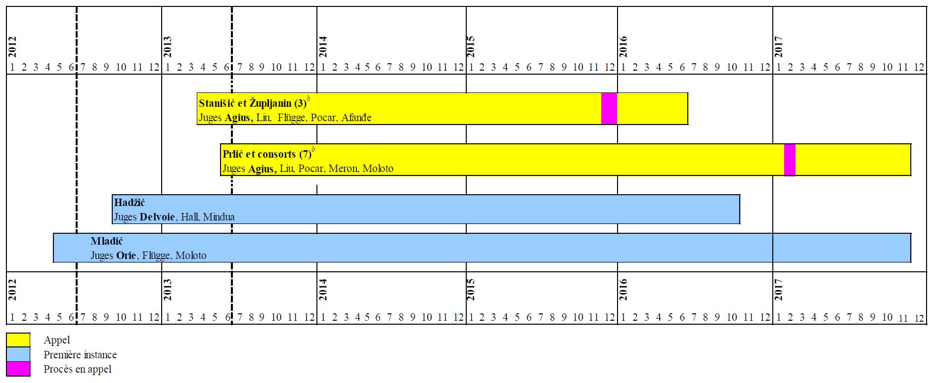 26. Dans l'affaire Le Procureur c. Mićo Stanišić et Stojan Župljanin, l'audience consacrée à l'appel a eu lieu le 16 décembre 2015. Les prévisions concernant la date du prononcé de l'arrêt sont inchangées et celui-ci devrait être rendu à la fin du mois de juin 2016.