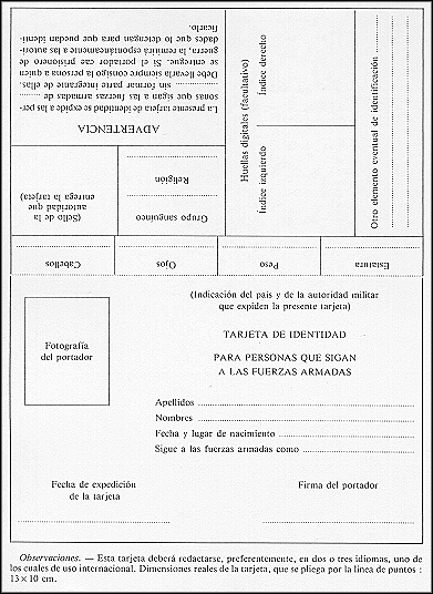 4) las personas que sigan a las fuerzas armadas sin formar realmente parte integrante de ellas, tales como los miembros civiles de tripulaciones de aviones militares, corresponsales de guerra, proveedores, miembros de unidades de trabajo o de servicios encargados del bienestar de los militares, a condición de que hayan recibido autorización de las fuerzas armadas a las cuales acompañan, teniendo éstas la obligación de proporcionarles, con tal finalidad, una tarjeta de identidad similar al modelo adjunto;